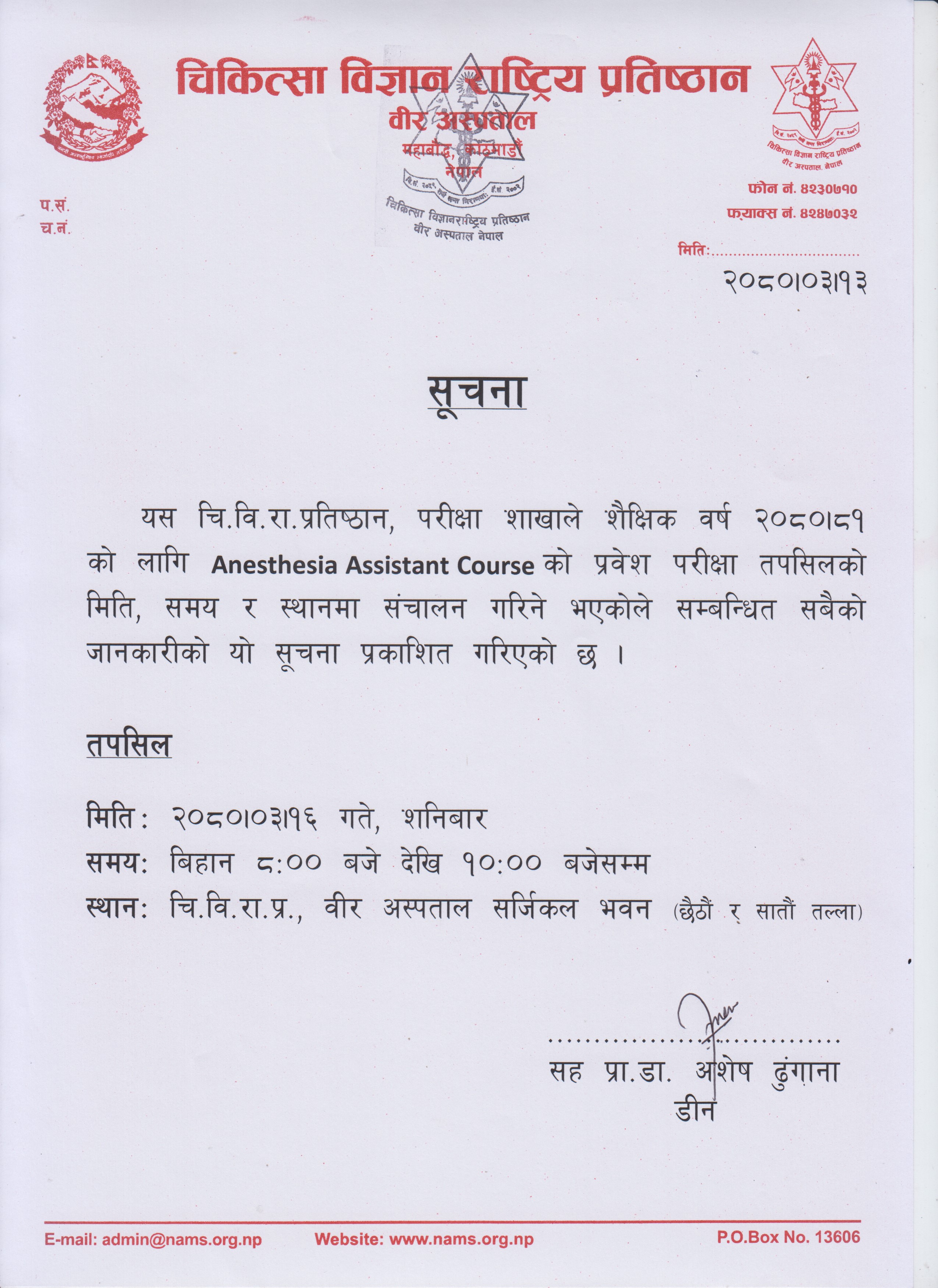 Anesthesia Assistant Course Entrance Notice (Entrance Exam को आबेदन फारम download गर्न सूचनामा गई download गर्नु होला ।)